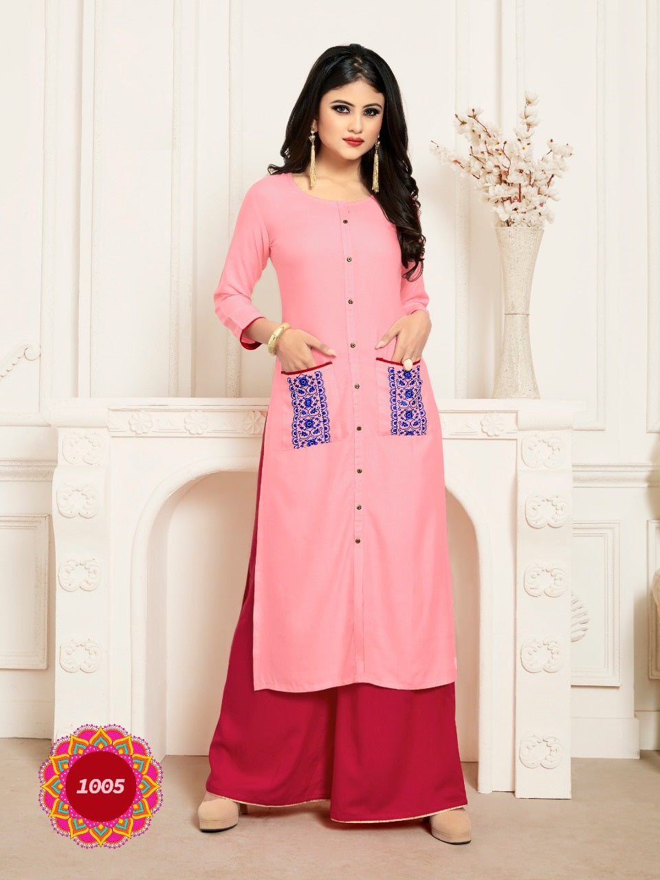 Kurti With Plazzo Pair Collection Are Here To Bring Freshness In Your Daily Life Style. You can wear it as casual wear or Traditional wear also for outdoor wear. It solid Design and Heavy Embroidery work you can wear It in Functions very Comfortable for Ocassional Use. Complete The Look : Pair with minimal jewellery, a complementing hang bag and comfortable Foot wear to complete the look.\nDetails\nPattern: KURTI WITH PLAZZO PAIR\nFabrics ? Heavy 14kg Rayon\nFancy Thread Embroidery Work