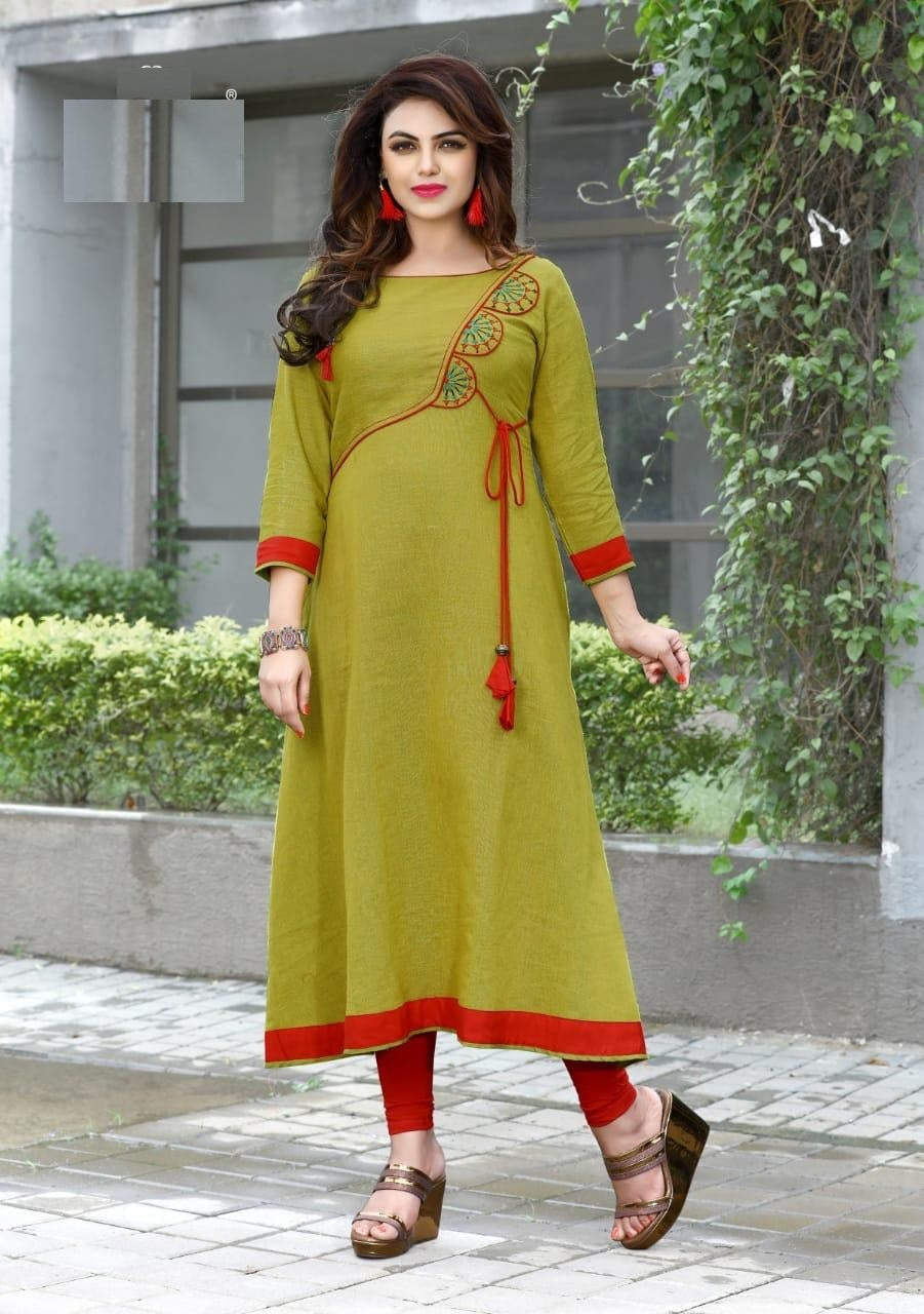 Heavy Rayon Embroidery Work A-line Kurti with 3/4th Sleeves.\n\nA Kurti is Quite an Essential Part of a Women?s Ethnic Collection. It is a Popular Ethnic Garment that Finds its Place in Every Occasion be it a Festivity or a Wedding or Even as a Part of Your Daily Wear. A Straight Kurti Can go Very Well With the Occasion of Choice when Matched with the Right Kind of Accessories and Footwear.