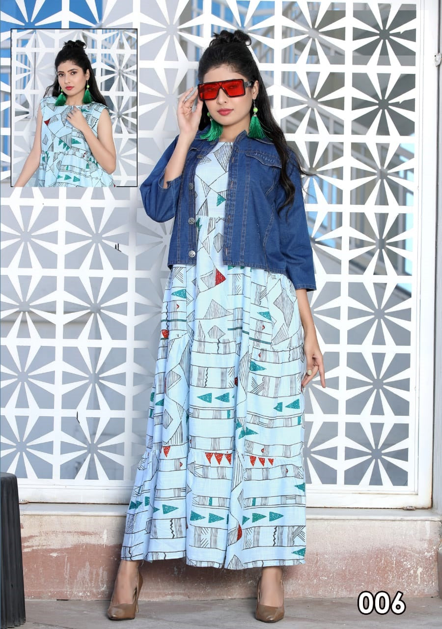 Stylish rayon slub printed long flaired kurti with treny cotton denim jacket